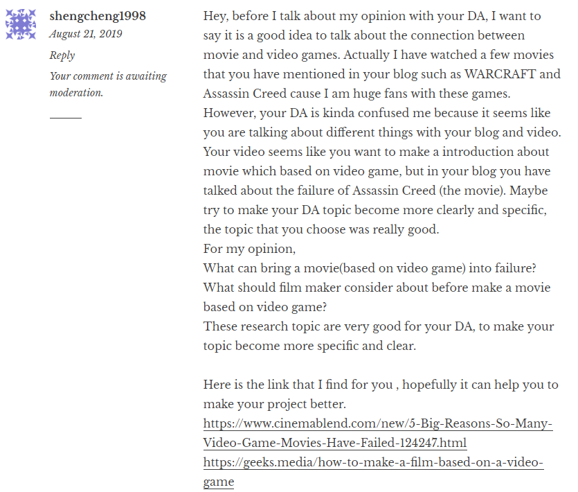 Her DA topic is Movies based on video games, I really like this topic because I am a huge fans with Warcraft and Assassin Creed.However, her pitch blog was also confused me because she was talked different things in her video and blog. I was suggested her to make her DA topic become united. So I find two links which can help her DA become better.
