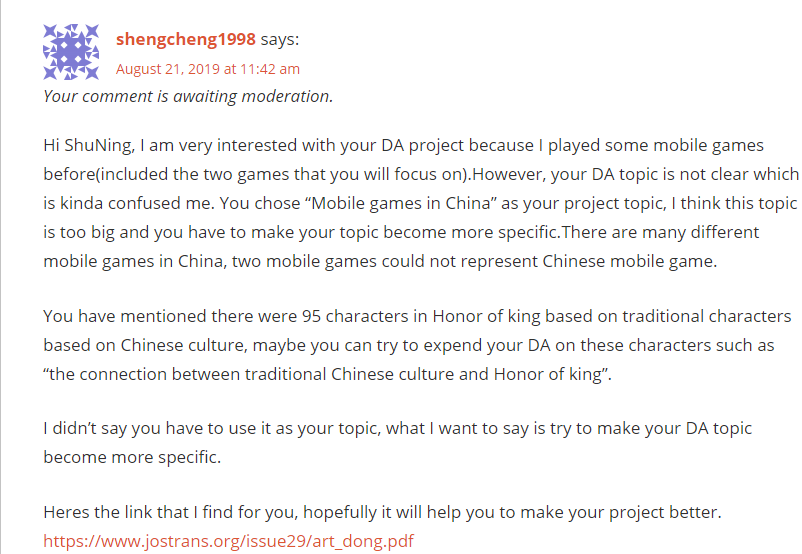 In ShuNing’s blog post, her DA topic is the mobile games in China which is BIG topic. She chose two games(Honor of King & PUBG) which are very popular in China. I think she made a few mistake in her blog.Firstly, the content of her pitch video and contextual essay was nearly the same. Secondly, her research topic is unclear and need to be more specific.Her pitch video was only 1 minute and 30 seconds long which is not close to 2 minute, she can add some extra stuff such as the background story of Chinese mobile game or why mobile game is so popular in China. Thirdly, she didn’t have any reference under her post. So I find a link for her to fix the problem.