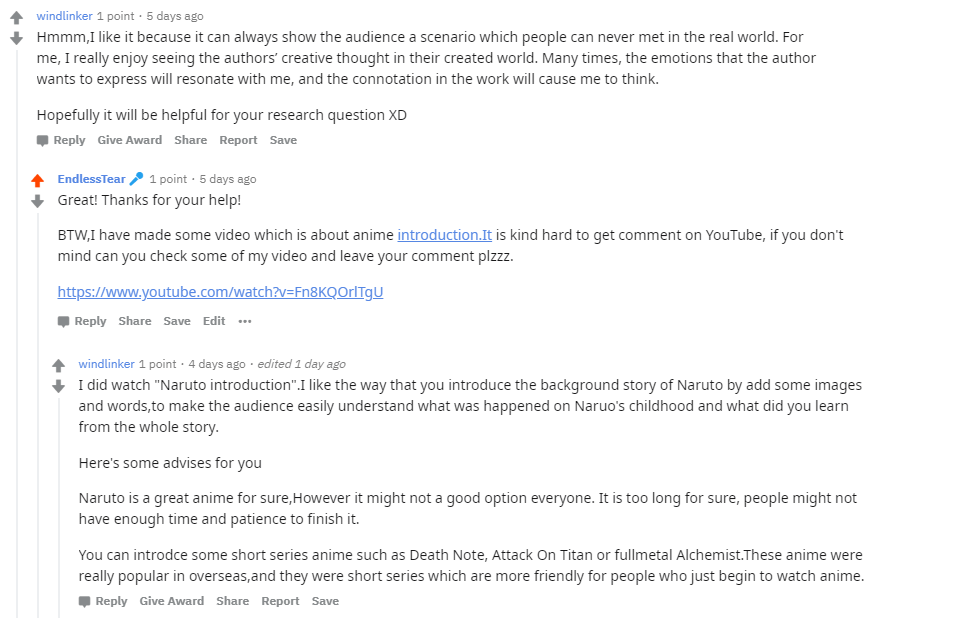 The first video that I made was Naruto introduction because Naruto is probably my favorite anime for all times. However, after I post it on YouTube and also post the link on Twitter/Reddit. I did receive some feedback which are really helpful for rest of my project.