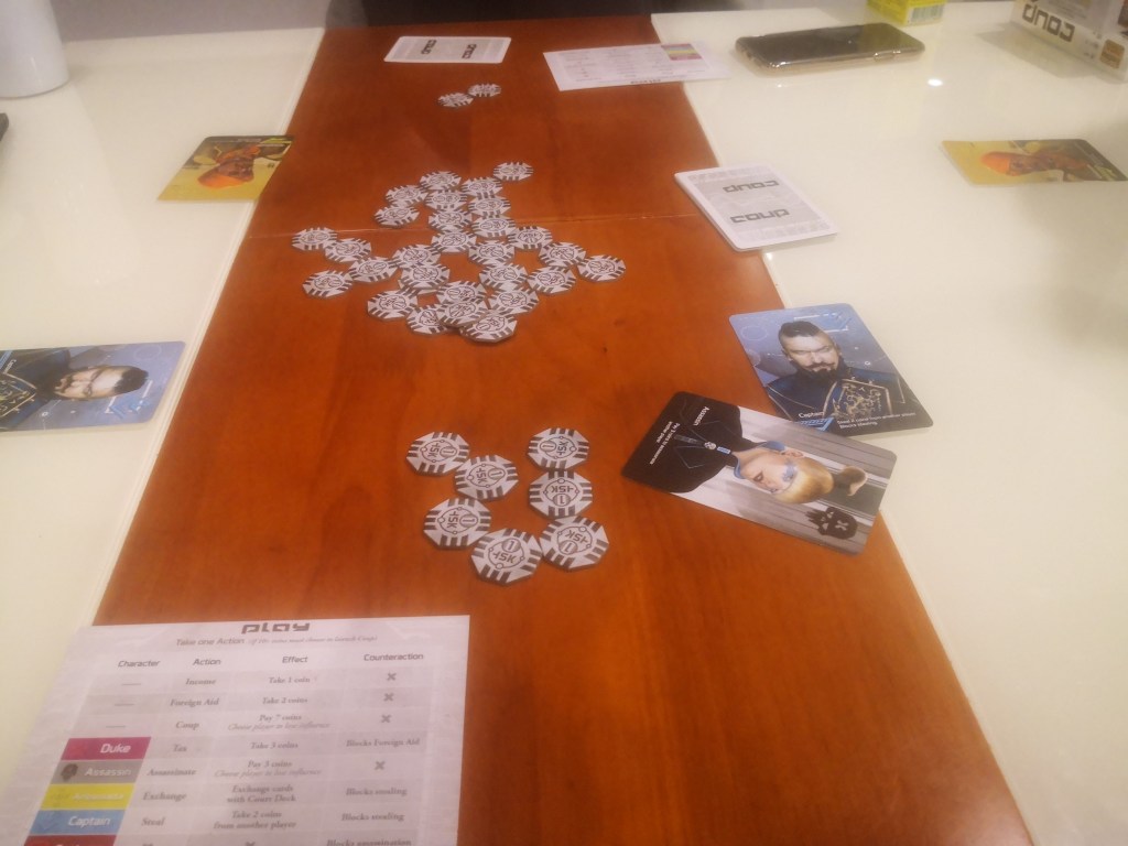 For my personal experience with Coup, I think it is a really friendly board game for people who never play board game before.The most fun that I found in Coup is lying to others,because nobody knows what influence you have at the beginning and you can easily earn coins by using duke even you don’t actually have it.Everyone in this game need to take risk to earn coins,it is really funny when people interact with each other.However,if everyone just want to be save and does not want to take the risk by take one coins in each tern,game would be super boring and you will lost interest very soon.Your game experience is really depend on the person that you are playing with.