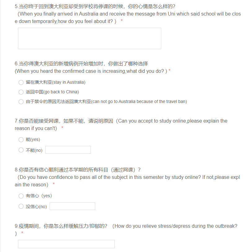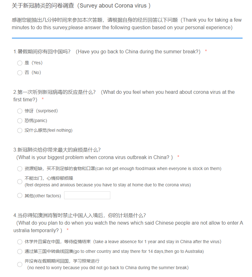 I think corona virus brings lots of negative effect to my friends from both physical and psychological,it is important for me to help them out of the shadow and this is also the reason/purpose for me to do this project.I am afraid that the depression will damage their mental health,so I made a questionnaire about what effect did corona virus brings to you and send it to my Chinese friends, understand what is their biggest trouble so I can help my roommates to stay positive and relieve their depression.