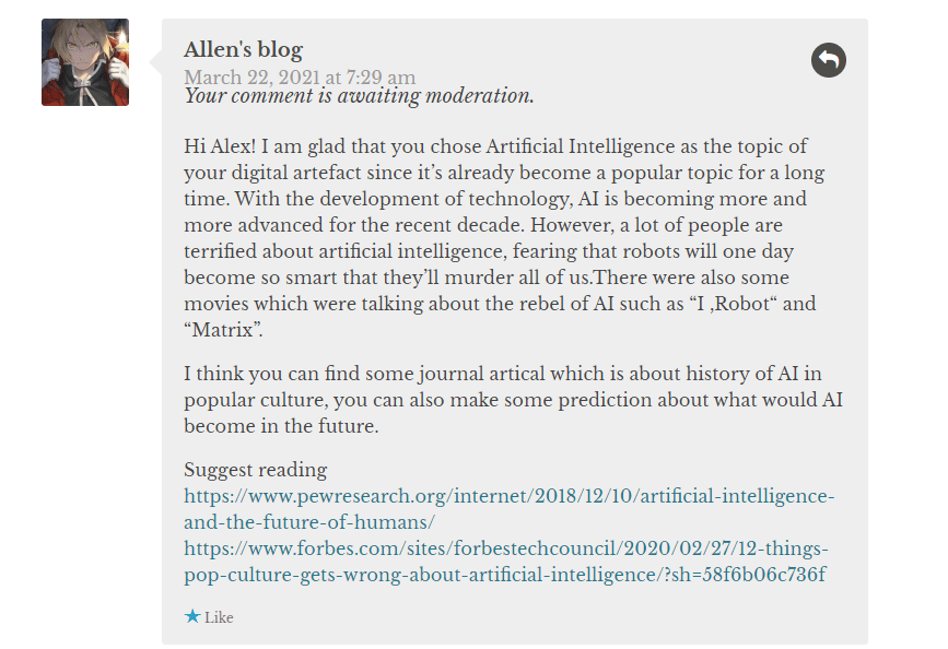 Alex decide to make a DA project which is about Artificial Intelligence in popular culture. I have seen a lots of movie talked about the struggle between human and robots such as “Matrix” and “I, Robot”, I also want to know why are there so many people scared of AI if we are the creator of them and we can also shut them down at anytime. I didn’t find any sources which can help her/audiences to have a better understanding of her digital artefact, so I think it is good for her to do some research about the relationship between artificial intelligence and popular culture to figure it out why are we afraid of the advance of AI in the future.