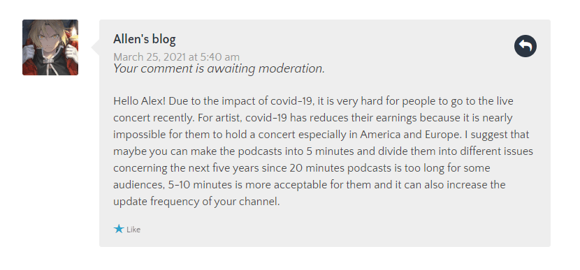 I am interested with Alex’s DA because his topic is related to live music, I love to go to the concert to enjoy the atmosphere at there. However, holding a concert is not allowed in most of the countries at this moment due to the global impact from covid-19. A lot of artists are worry about their music career because the profit from live music is a important part of their income. Will live music disappear in the future if everyone choose to watch it online? I really can not wait for his podcasts but I think 20 minutes might be too long for one episode, I think it might be better if he can divide the content into 5-10 minutes so he can make more episode so as the audiences we don’t need to wait too long for the update.
