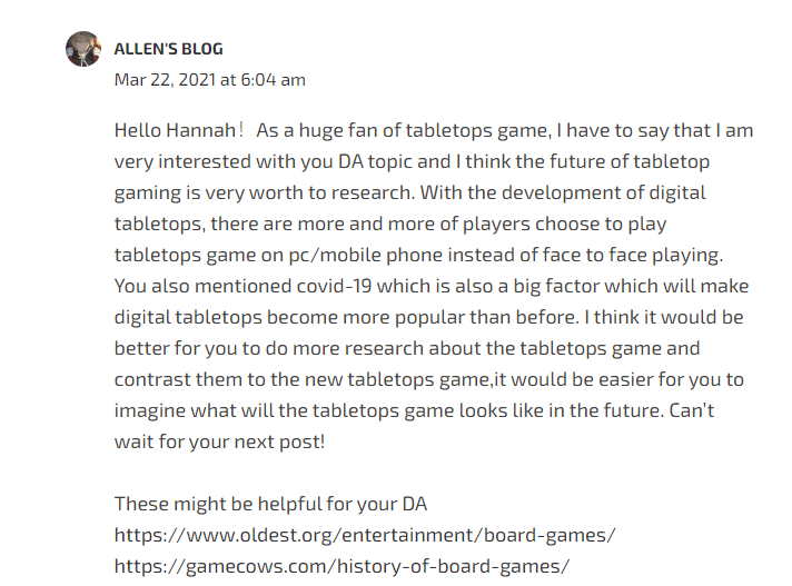 Hannah chose to do a project about tabletops game which is very interesting to me because I really like to play tabletops game with my family/friends on weekend. Tabletops game is popular in worldwide for a really long time and the creator is always try to improve the playability of tabletops games in recent decade. However with the development of technology, it is avaliable for us to play tabletops game on our PC and mobile phone and the amount of online tabletops game player is still increasing due to the impact of covid-19. Will tabletops game be compeletly replace when everyone is playing it online?Hannah did talk about her opinion that tabletos game will not fade away because there will be a group of people who want to play it in person just like me. I think the future of tabletops game is hard to predict and that’s why I want to see her next post as soon as possible. For my suggestion I think it’s good for her to do some research about the history of tabletops game, it is easier for her to predict what will the talbletops game looks like in the future if she understand the evolution of tabletops game.