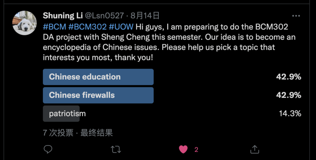 We decide to make another tweet poll by given 3 different topics so people can choose the option which they are interested in. According to the result from twitter poll, people are interested in Chinese education/Chinese firewalls. We decide to talk about Chinese education system for the first video.
