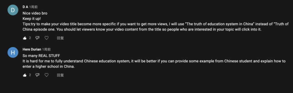 Luckily, we did receive some long comments from our audience which let us realize the problem that we have from the video. Firstly, our video title was unclear so the audience wouldn’t know what is this video talking about through the title. It is hard to get user’s attention if the video title was not attractive and we only got a few of views from it. Lacking of examples is also another problem for our video, it is hard to fully understand the education system of China from our video if the viewer is not Chinese. We have spent most of time of the video to explain the pros and cons for Chinese education system and didn’t provide example to explain the system itself. For me, I have a little brother who is study in primary school in China. It would be better if I can film “the day of primary school student in China” to reflect how does it feel to live in our system.